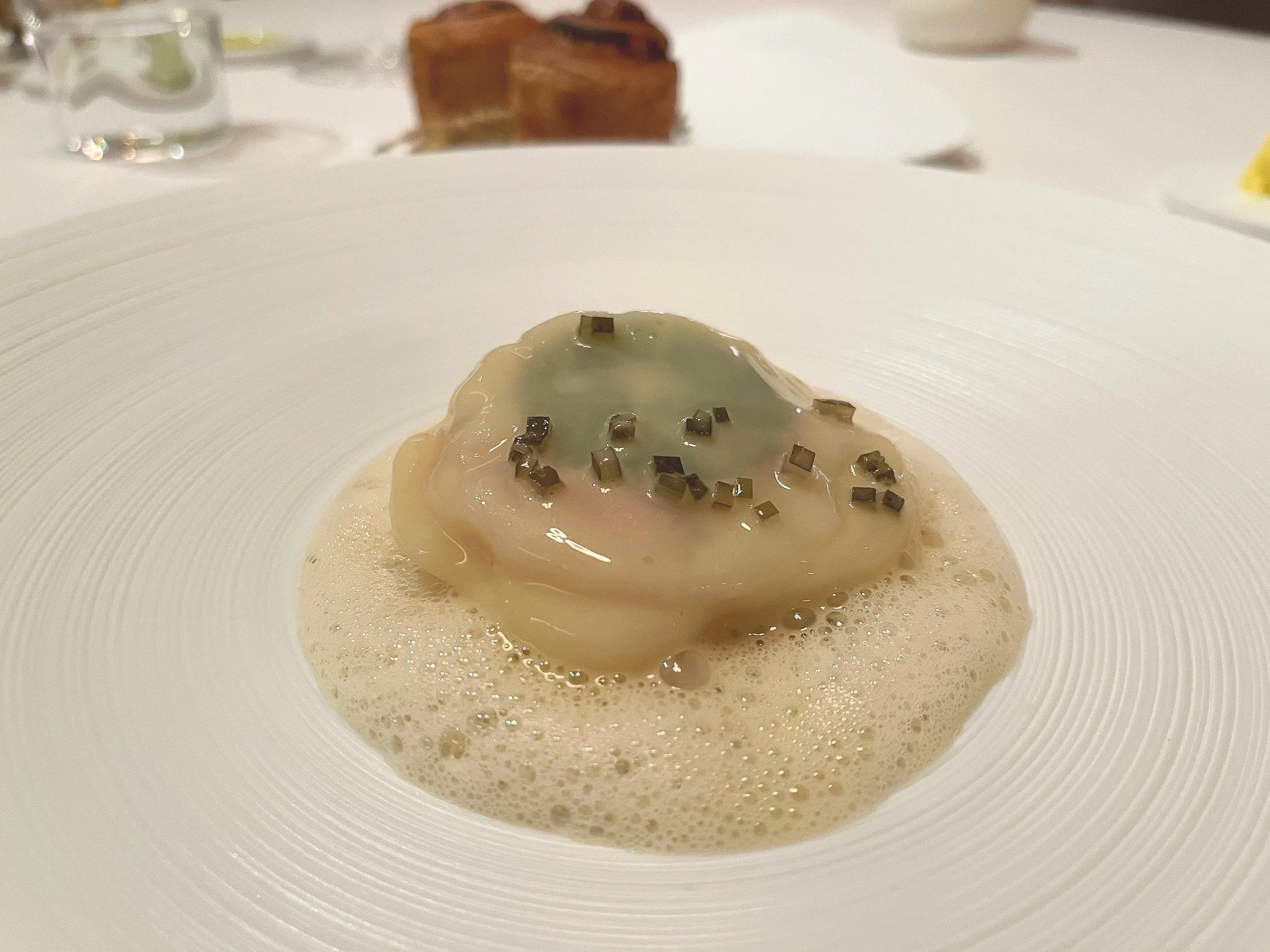 Anyway, the langoustine itself was great. Fresh, soft, well-cooked. The ravioli itself came apart from the langoustine very easily so it was kind of like eating separate pieces. The Shiso was practically melded to the pasta, and the pasta itself was a little sticky/stretchy in that it wasn’t very easy to cut through but the mouthfeel was fine. I wasn’t a fan of the flavour of what I assume was the ‘leek fondue’, i.e., the bed of foamy sauce. I could’ve happily eaten the langoustine alone.