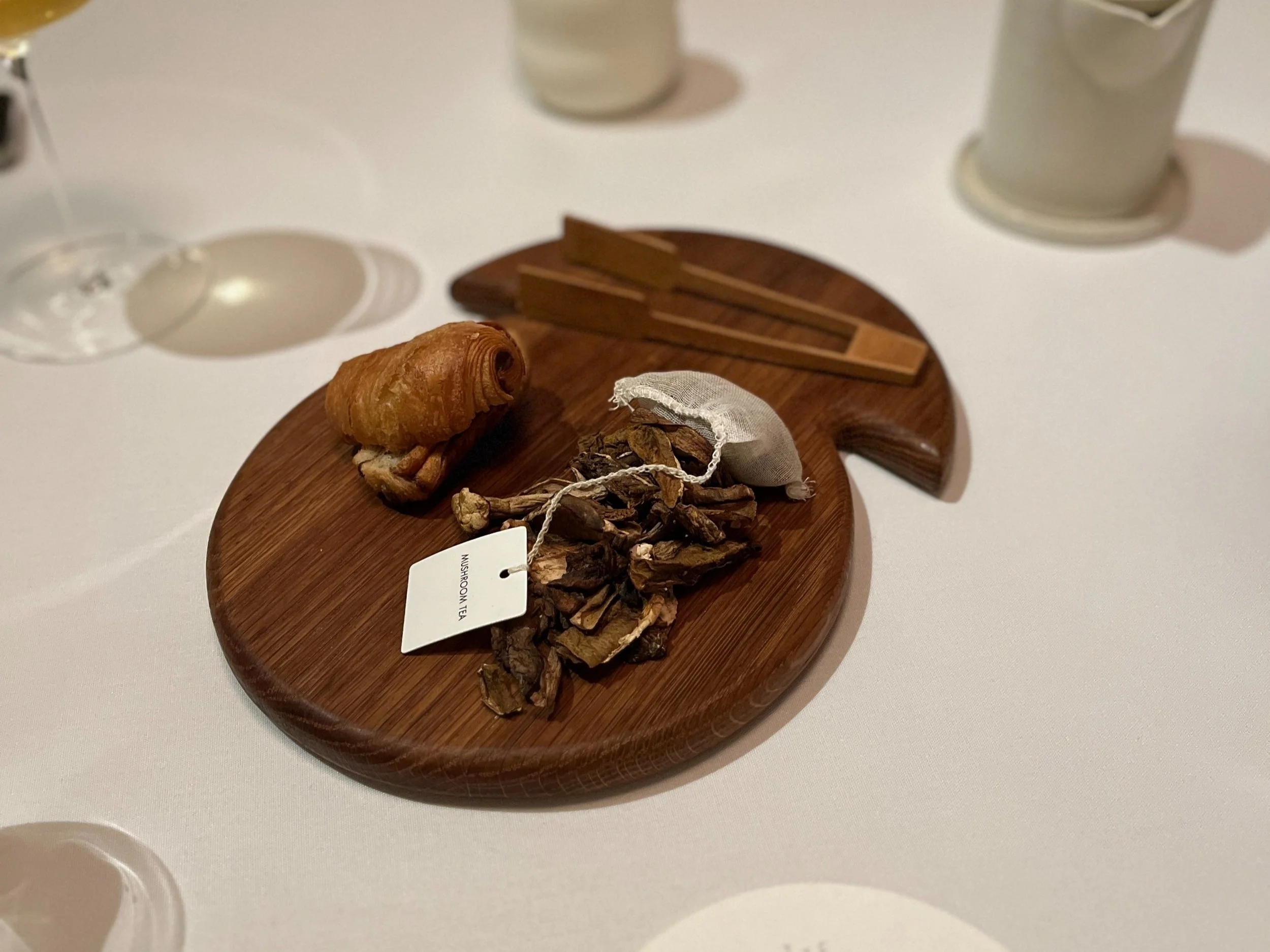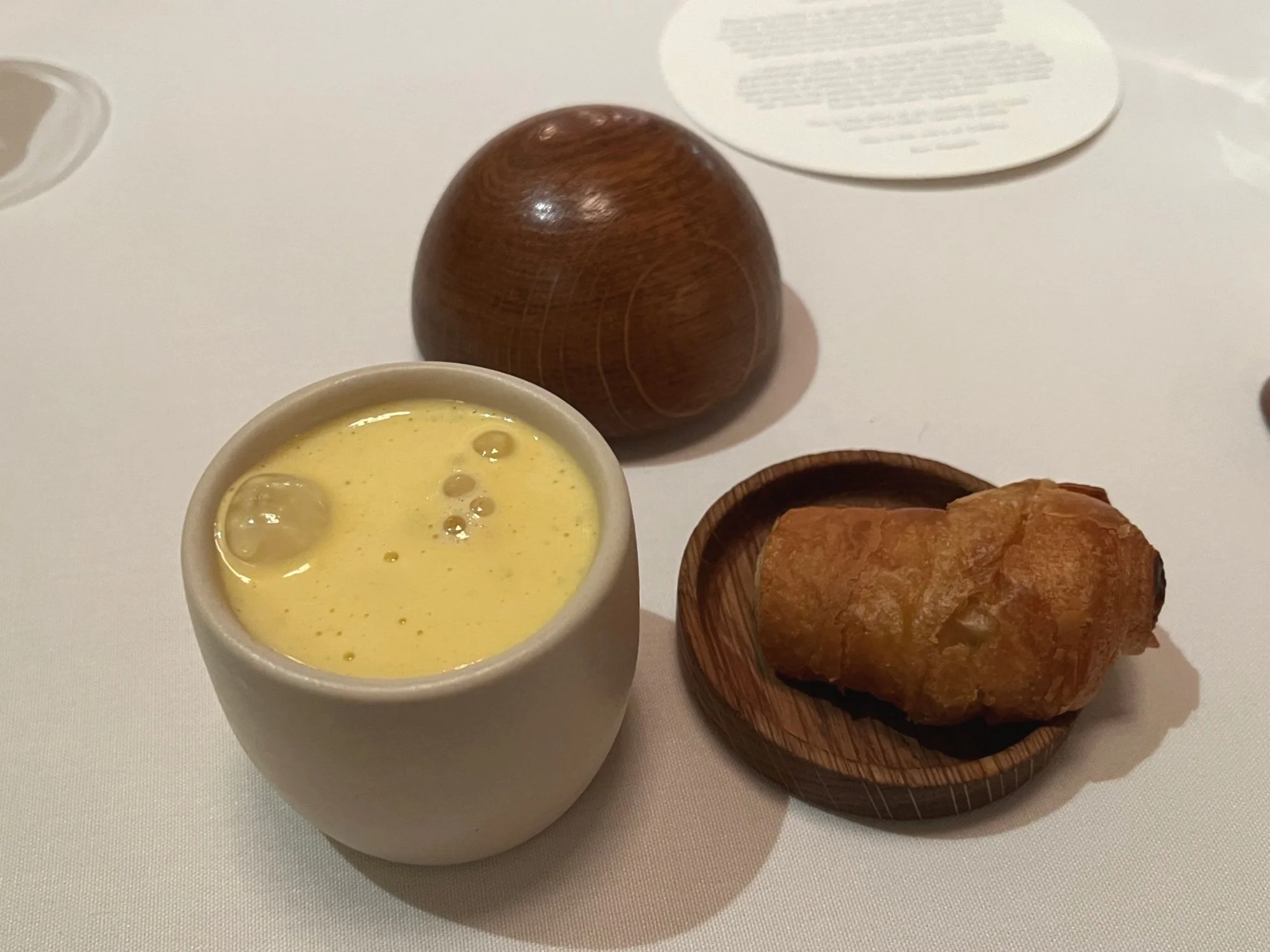 The next starter was the good old mushrooms and bread. This was the same as in 2020. Mushroom tea poured into some mushroomy foam, served alongside mushroom brioche. I appreciated that the little chives(?) were omitted from mine. It was as delicious as it was last time. Main differences include a more polished adorable mushroom cup, and a teapot that looks less like a French press.