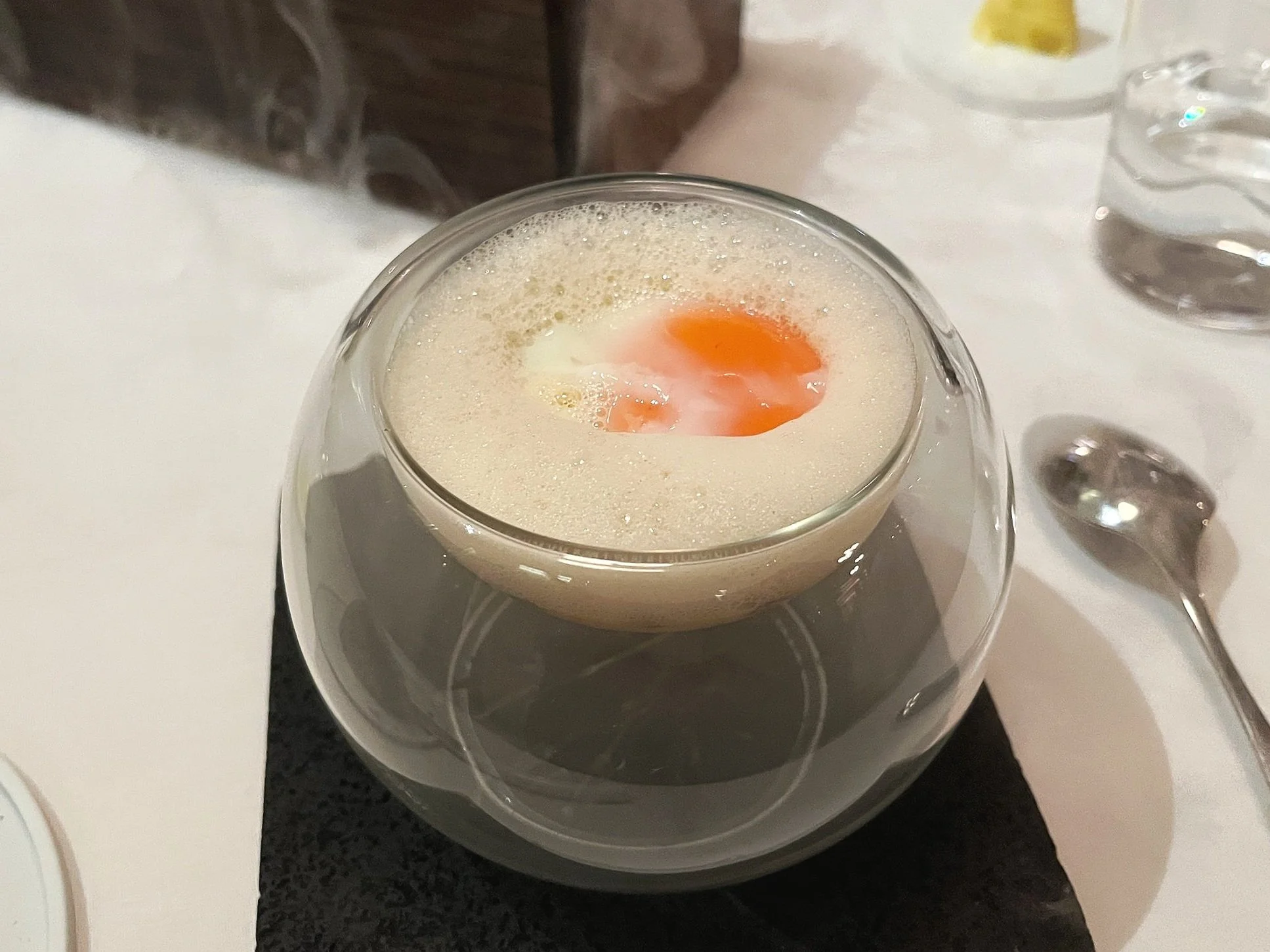 Their signature rosemary smoked organic egg. The presentation for this one is always incredible. Each soft boiled egg was plopped into our respective cups of smoked potato foam and chorizo iberico bits. This was also when they served the red wine.