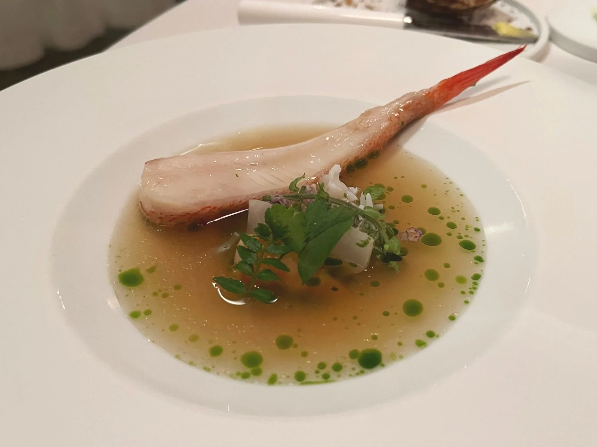 Steamed kinki from Hokkaido with some squid, Obsiblue prawn & prawn consomme with lemongrass, and Japanese turnip. I think the plating could’ve been better… The tail is a nice touch but the flesh of the fish didn’t add to to the look.