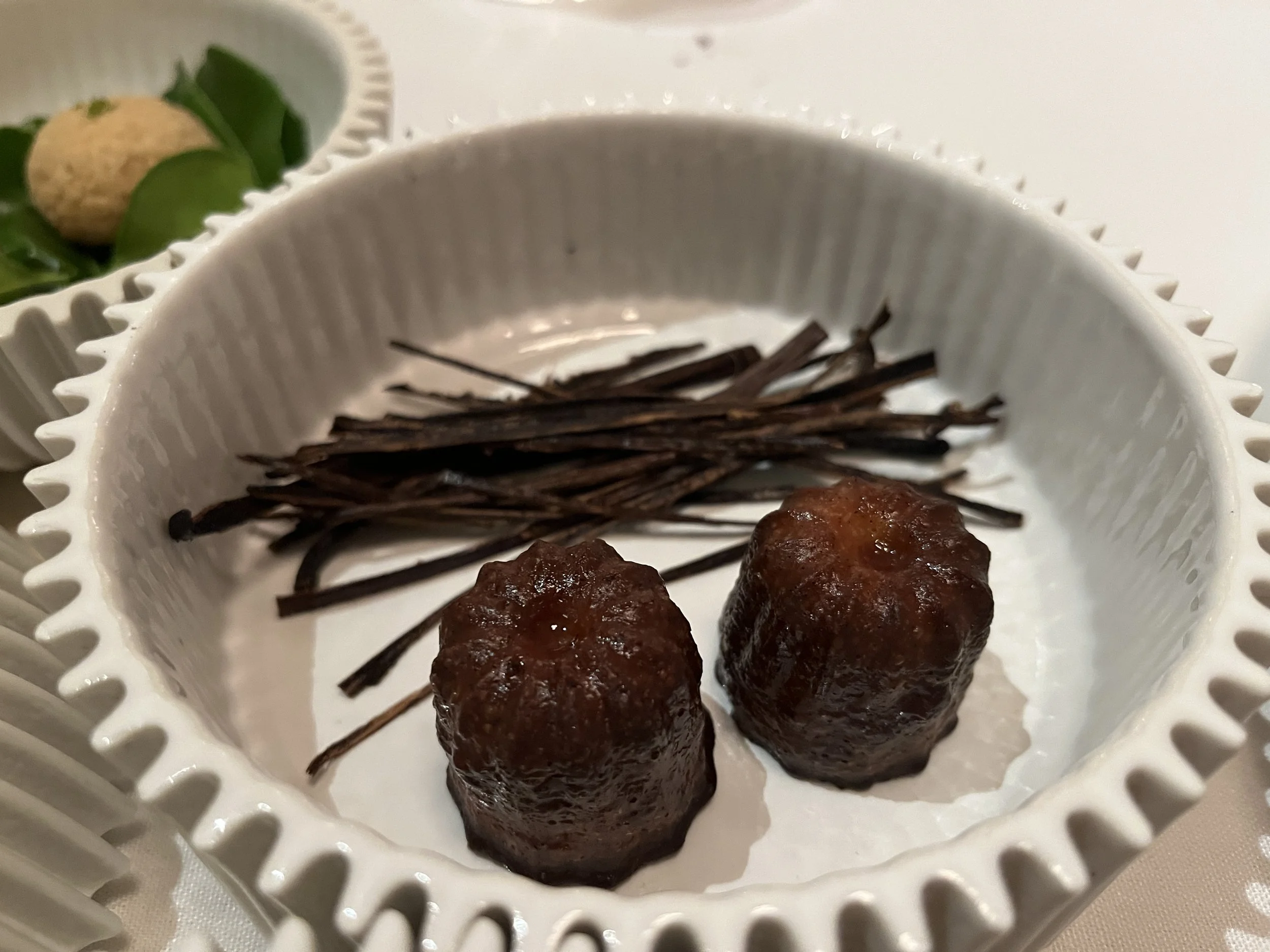 Pigeon! Another signature. A presentation version was shown to us in a pot full of flowers before the dish arrived. The pigeon that arrived was a breast piece with a leg encrusted with Cambodian black pepper.